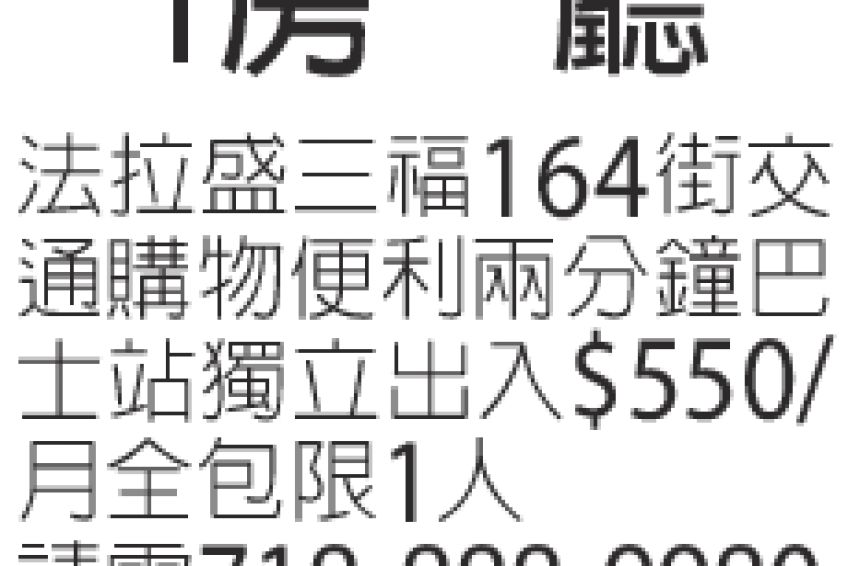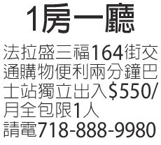 法拉盛三福164街,交通購物便利,兩分鐘巴士站,獨立出入,$550/月全包,限1人
