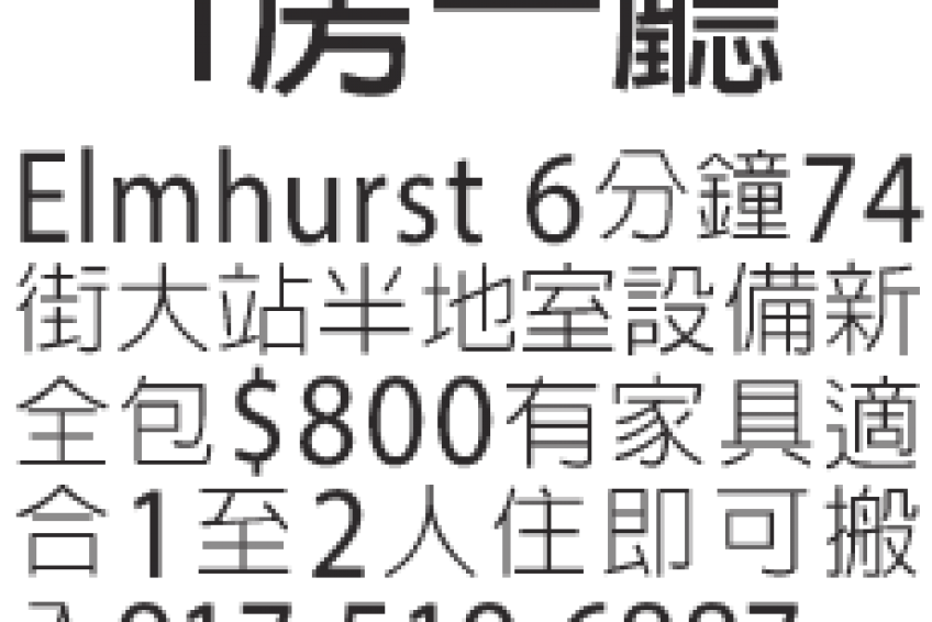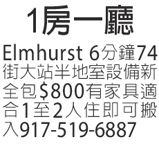 Elmhurst,6分鐘74街大站半地室,設備新全包$800有家具適合1至2人住即可搬入。917-519-6887