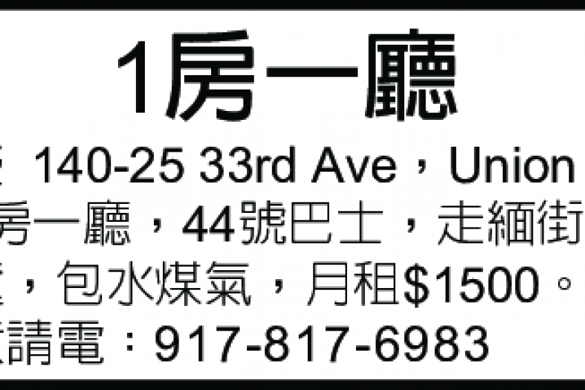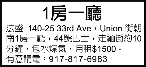 法盛140-25 33rd Ave ,Union 街朝南一房一廳,44號巴士,走緬街約10分鐘,包水煤氣,月$1500 。電話917-817-6983
