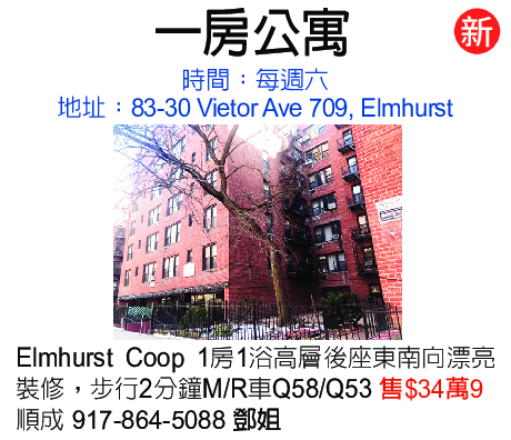 Elmhursl Coop 1房1浴高層後座東南向漂亮裝修,步行2分鐘MR車Q58Q53售$34萬9