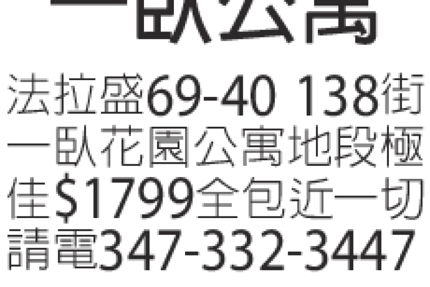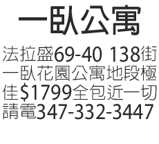 法拉盛69-40 138th街,一臥花園公寓,地段極佳,$1,799(全包)近一切,電: (347) 332- 3447