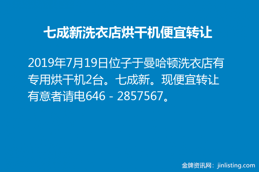 七成新洗衣店烘干机便宜转让 位子于曼哈顿洗衣店有专用烘干机2台。七成新。现便宜转让有意者请电646-2857567。