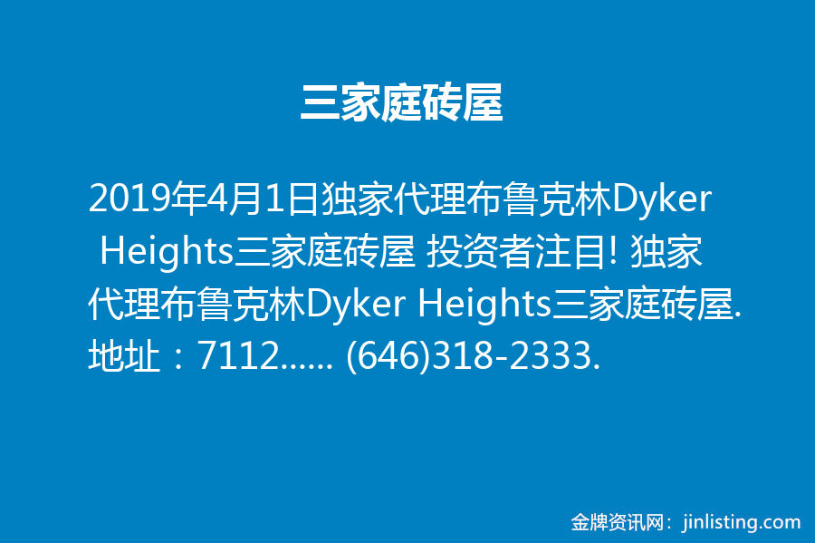 独家代理布鲁克林Dyker Heights三家庭砖屋 投资者注目! 独家代理布鲁克林Dyker Heights三家庭砖屋. 地址:7112 15th Ave, Brooklyn 11228. 地面三层 土库. 屋绩:20×63!地绩: 20×90. 每层面绩超过1200平方尺. 10睡房 6浴房. 暖气热水炉全部分开. 3分钟步行至71街D车地铁站. 靠近布鲁克林8大道唐人街. 好学区. 仅售:165万. 详情请电:Allan 朱先生 (646)318-2333.