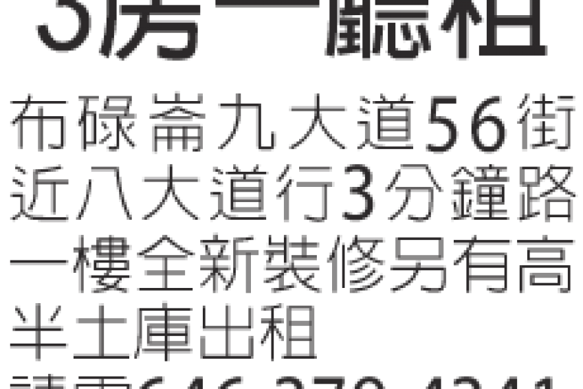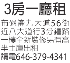 布碌侖九大道56銜近八大道行3分鐘路,一樓全新裝修。另有高半土庫出租,請電646-379-4341
