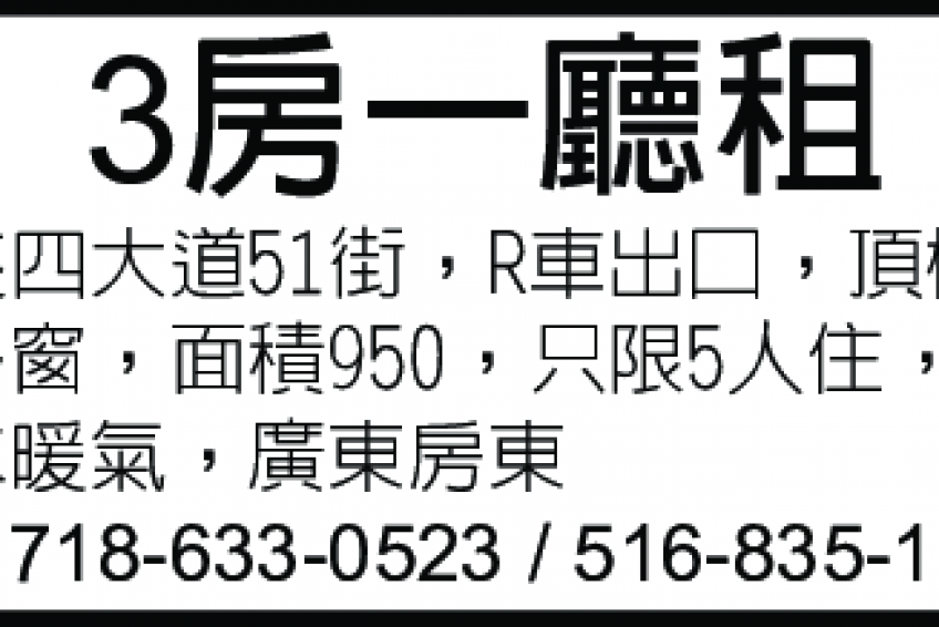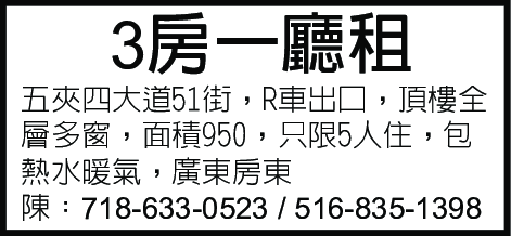 位於五夾四大道51街,R車出囗,頂樓全層多窗,面積$950,只限5人住,包熱水暖氣,廣東房東陳