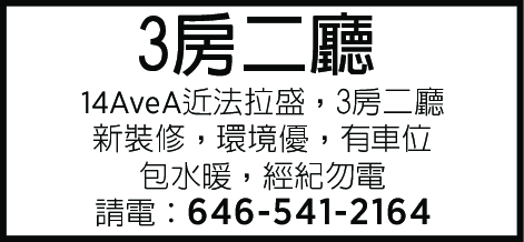 14AveA. 近法拉盛,新裝修,環境優,有車位,包水暖,經紀勿電: