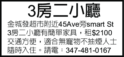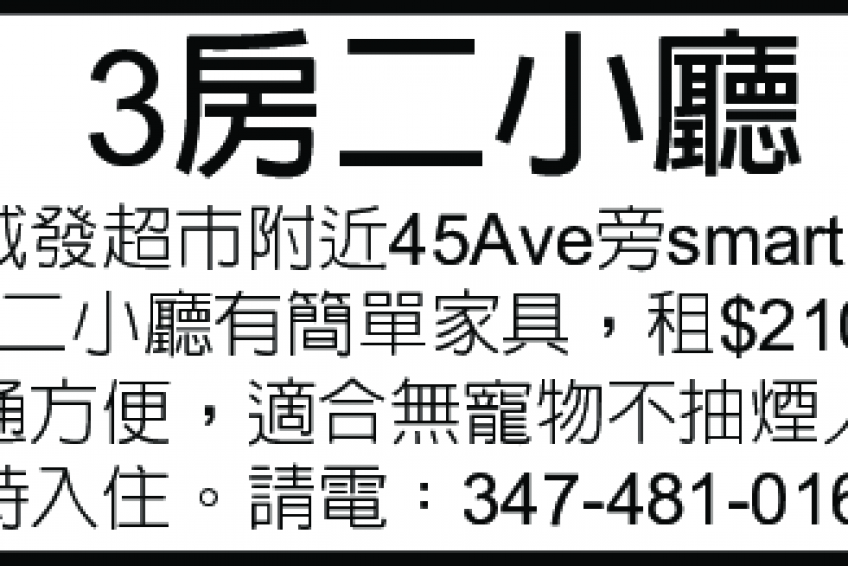 金城發超市附近45Ave 旁smart st三房兩小廳租$2100交通方便有簡單家具,適合無寵物不抽煙人士,隨時入住請電347-481-0167