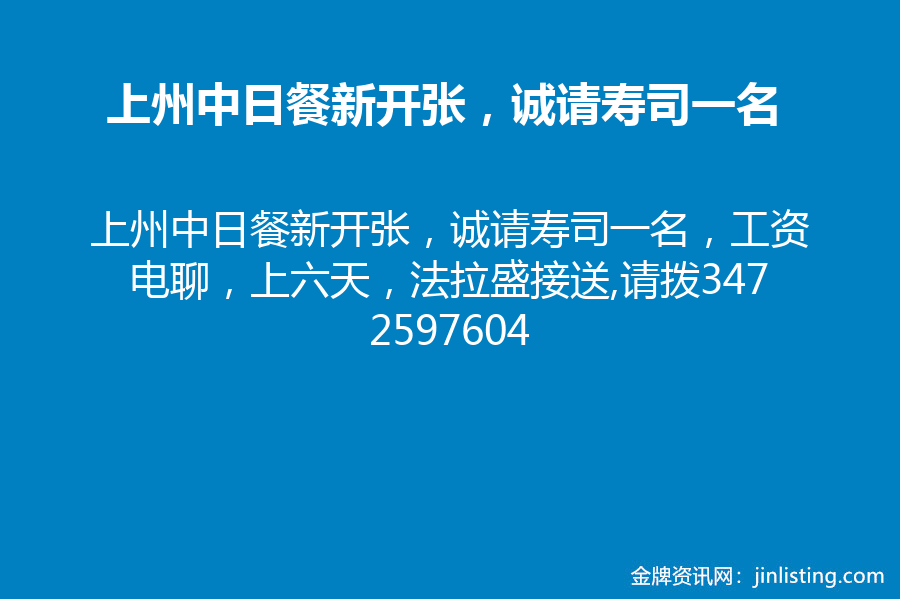 上州中日餐新开张,诚请寿司一名,工资电聊,上六天,法拉盛接送,请拨3472597604