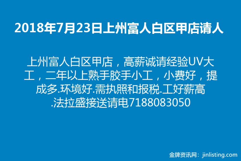 上州富人白区甲店,高薪诚请经验UV大工,二年以上熟手胶手小工,小费好,提成多.环境好.需执照和报税.工好薪高.法拉盛接送请电7188083050