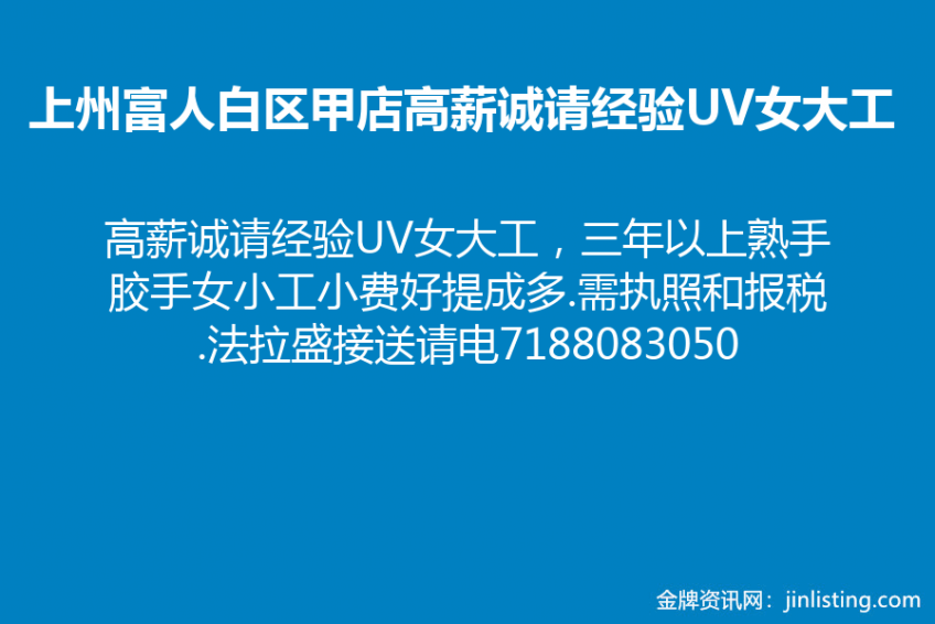 上州富人白区甲店,高薪诚请经验UV女大工,三年以上熟手胶手女小工,小费好,提成多.需执照和报税.法拉盛接送请电7188083050
