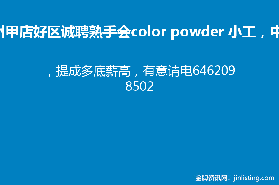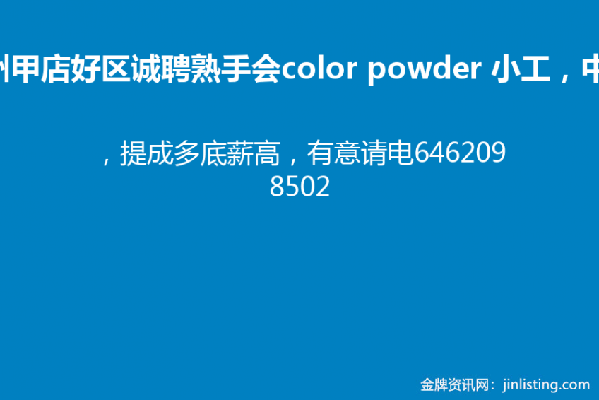 上州甲店好区诚聘熟手会color powder 小工,中工,提成多底薪高,有意请电6462098502