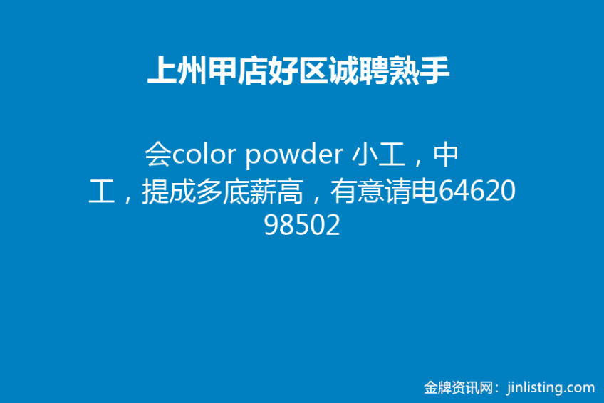 上州甲店好区诚聘熟手会color powder 小工,中工,提成多底薪高,有意请电6462098502