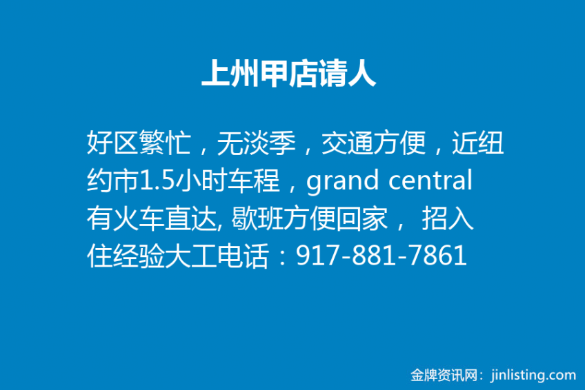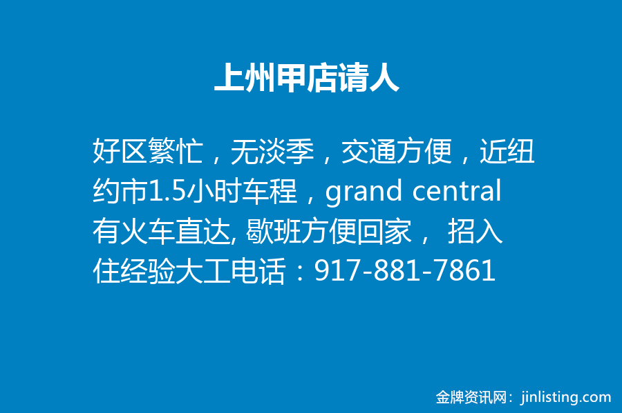 上州甲店,好区繁忙,无淡季,交通方便,近纽约市1.5小时车程,grand central 有火车直达, 歇班方便回家, 招入住经验大工电话:917-881-7861