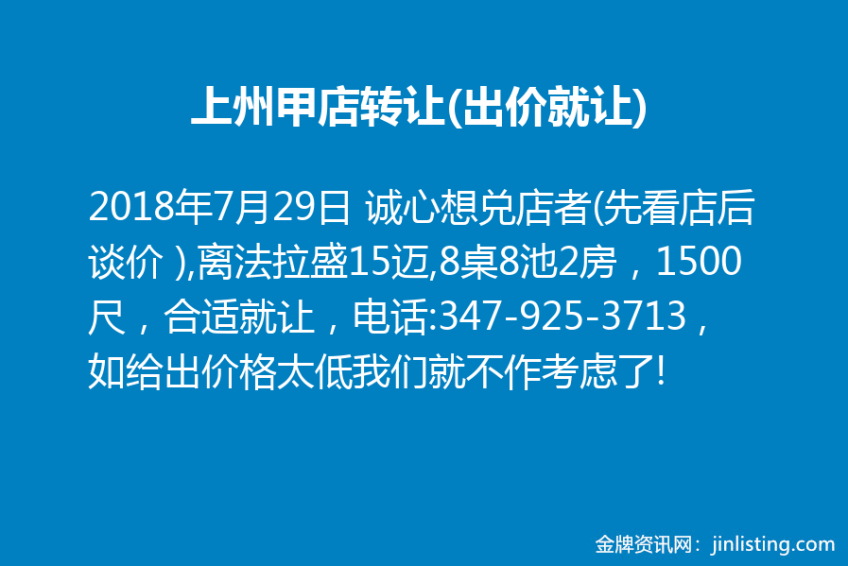 上州甲店转让(出价就让),近法拉盛25分钟车程, 诚心想兑店者(先看店后谈价 ),离法拉盛15迈,8桌8池2房,1500尺,合适就让,电话:347-925-3713 ,如给出价格太低我们就不作考虑了!