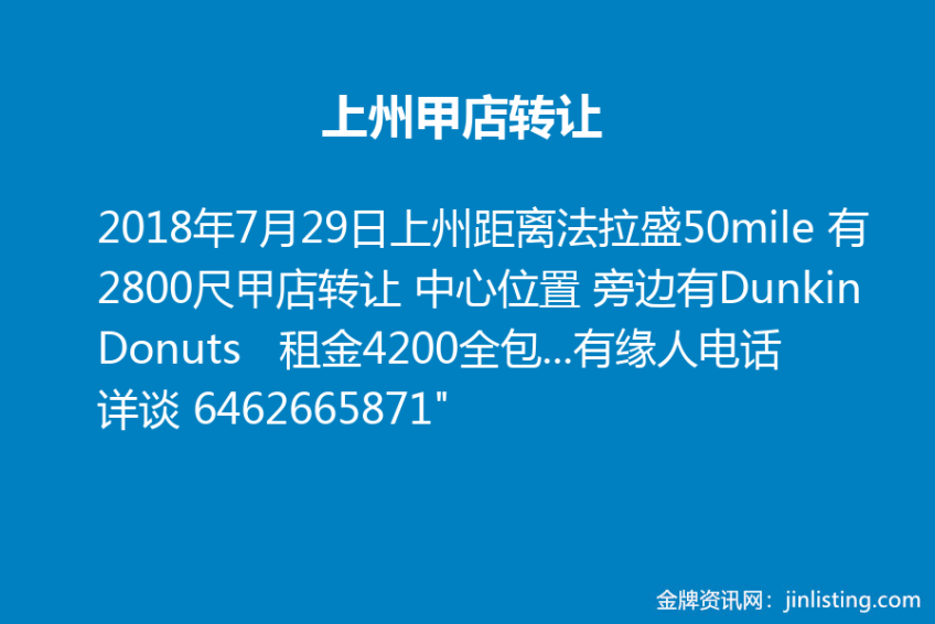 上州距离法拉盛50mile 有2800尺甲店转让 中心位置 旁边有Dunkin Donuts 租金4200全包 另冬天包暖气 店内有8脚池 8手台 5个足疗按摩床 通风系统 有缘人电话详谈 6462665871