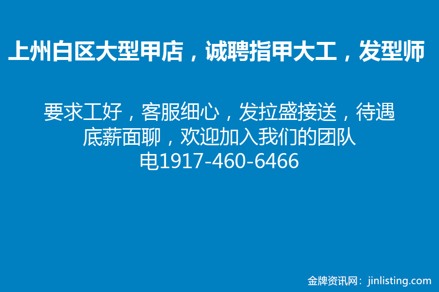 上州白区大型甲店,诚聘指甲大工,发型师。要求工好,客服细心,发拉盛接送,待遇底薪面聊,欢迎加入我们的团队电1917-460-6466