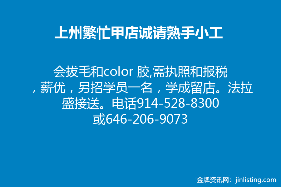 上州繁忙甲店,诚请熟手小工,会拔毛和color 胶,需执照和报税,薪优,另招学员一名,学成留店。法拉盛接送。电话914-528-8300或646-206-9073