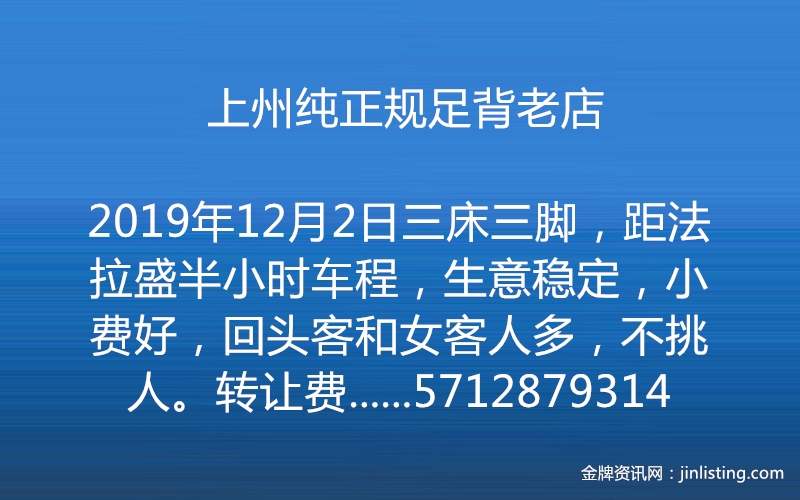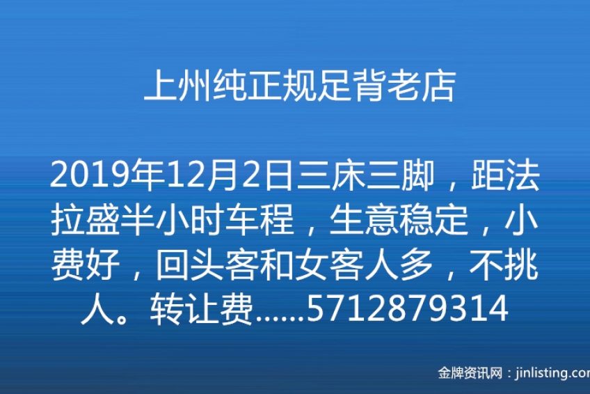 上州纯正规足背老店,三床三脚,距法拉盛半小时车程,生意稳定,小费好,回头客和女客人多,不挑人。转让费三万五,回本快接手就赚。电话:5712879314