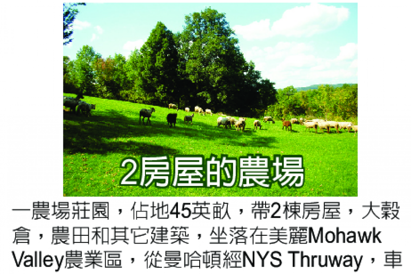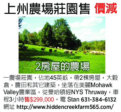 一農場莊園,佔地45英畝,帶2棟房屋,大穀倉,農田和其它建築,坐落在美麗Mohawk Valley農業區,從曼哈頓,經NYS Thruway,車程3小時,售 $299,000 | http://www.hiddencreekfarm565.com |