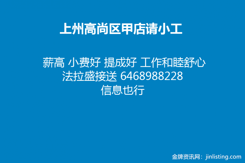 上州高尚区甲店请小工 薪高 小费好 提成好 工作和睦舒心 法拉盛接送 6468988228 信息也行