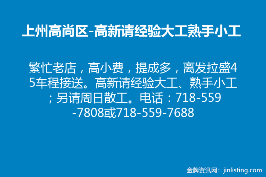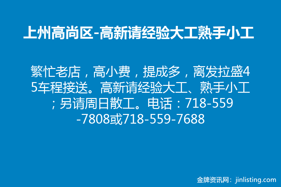 接送。高新请经验大工、熟手小工;另请周日散工。电话:718-559-7808或718-559-7688”