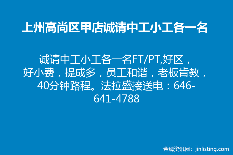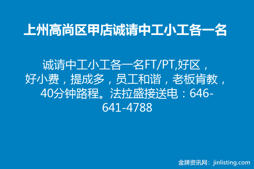 上州高尚白人区甲店诚请UV大工,color gel小工,有执照能报税优先,薪高小费好,法拉盛接送,电话646-505-7943