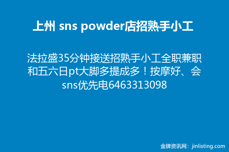 上州好区忙店法拉盛35分钟接送!sns powder店招熟手小工!全职兼职和五六日pt!大脚多提成多!按摩好、会sns优先!可报税!店内气氛好!想找稳定工作的请电6463313098