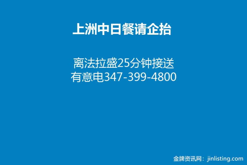 上洲中日餐请企抬,离法拉盛25分钟接送有意电347-399-4800.