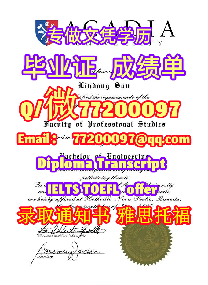 专业制作Acadia毕业证书买阿卡迪亚大学毕业证成绩单Q/微:77200097有Acadia文凭证书精仿Acadia学位证书能办Acadia成绩单制作阿卡迪亚大学文凭证书offer雅思托福Acadia University Diploma Degree Transcript