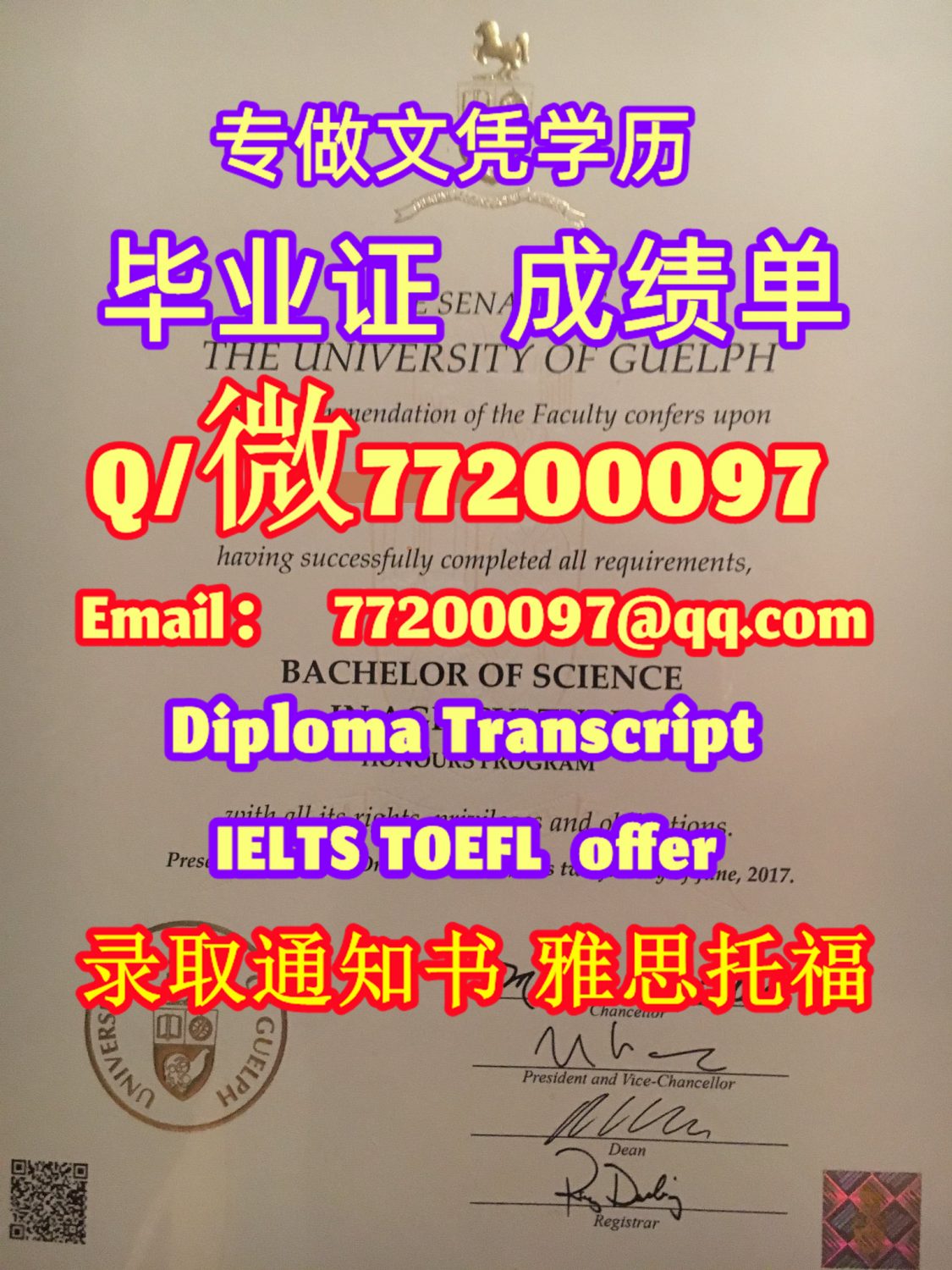 专业制作Guelph毕业证书买圭尔夫大学毕业证成绩单Q/微:77200097有Guelph文凭证书精仿Guelph学位证书能办Guelph成绩单制作圭尔夫大学文凭证书offer雅思托福University of Guelph Diploma Degree Transcript