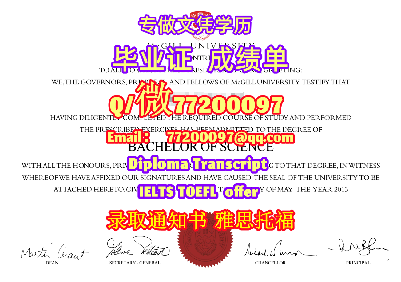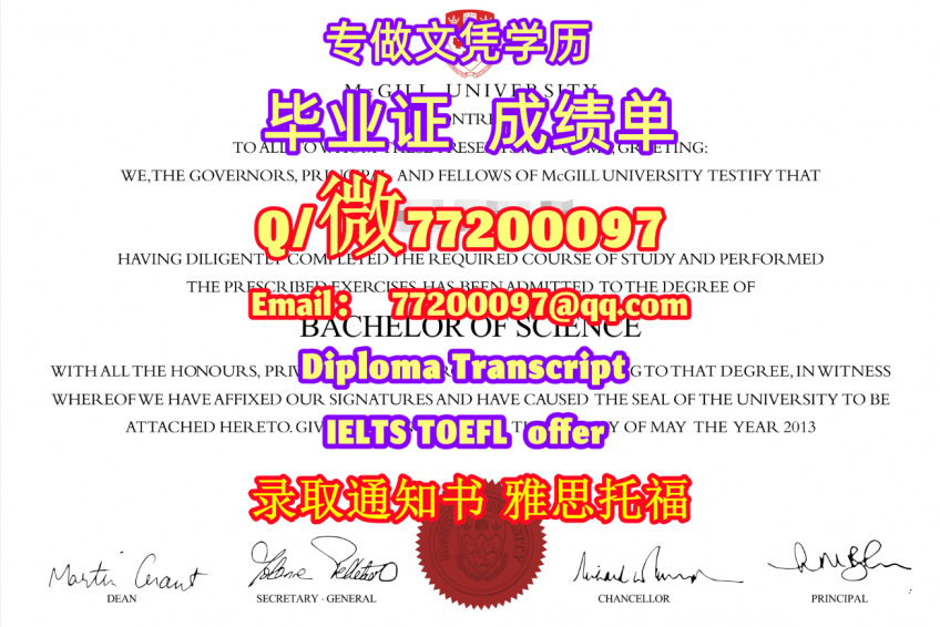 专业制作McGill毕业证书买麦吉尔大学毕业证成绩单Q/微:77200097有McGill文凭证书精仿McGill学位证书能办McGill成绩单制作麦吉尔大学文凭证书offer雅思托福McGill University Diploma Degree Transcript