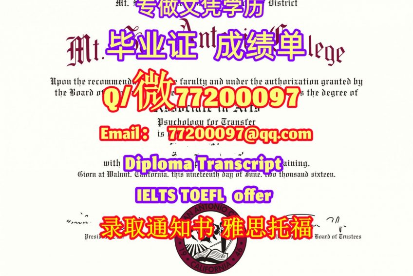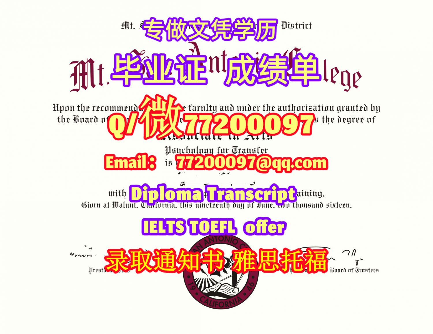 专业制作Mt. SAC毕业证书买蒙特圣安东尼奥学院毕业证成绩单Q/微:77200097有Mt. SAC文凭证书精仿Mt. SAC学位证书能办Mt. SAC成绩单制作蒙特圣安东尼奥学院文凭证书雅思托福Mt. San Antonio College Bachelor/Master Diploma Degree Transcript
