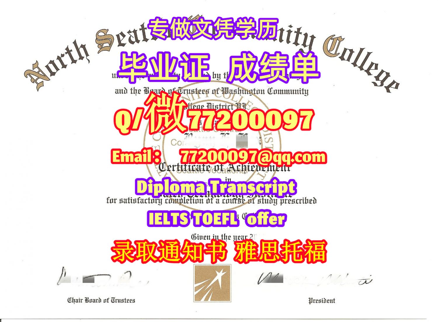 专业制作NSCC毕业证书买北西雅图社区学院毕业证成绩单Q/微:77200097有NSCC文凭证书精仿North Seattle学位证书能办NSC成绩单制作北西雅图社区学院文凭证书雅思托福North Seattle Community College Bachelor/Master Diploma Degree Transcript