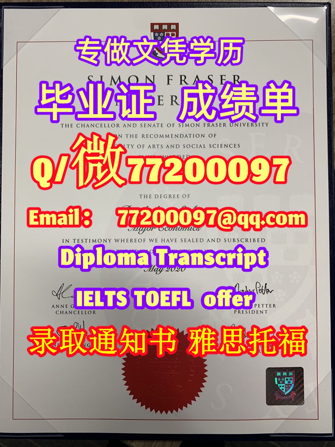 专业制作SFU毕业证书买西蒙弗雷泽大学毕业证成绩单Q/微:77200097有SFU文凭证书精仿SFU学位证书能办SFU成绩单制作西蒙弗雷泽大学文凭证书offer雅思托福Simon Fraser University Diploma Degree Transcript