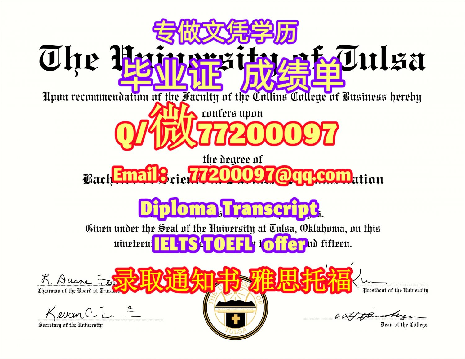 专业制作UTulsa毕业证书买塔尔萨大学毕业证成绩单Q/微:77200097有Tulsa文凭证书精仿UTulsa学位证书能办UTulsa成绩单制作塔尔萨大学文凭证书雅思托福University of Tulsa Bachelor/Master Diploma Degree Transcript