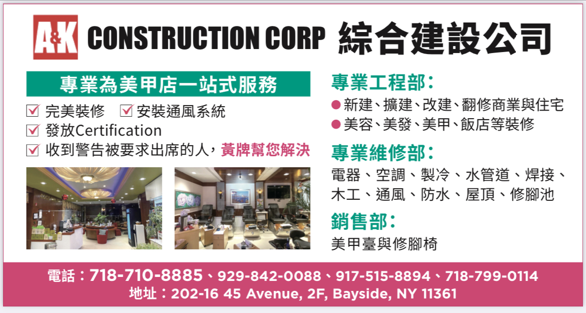 A&K Construction Corp綜合建設公司有24年豐富的工程及裝修經驗,已完成了500多個工程項目,包括韓國紐約總領事館及迎賓館的裝修工程。業務範圍包括: