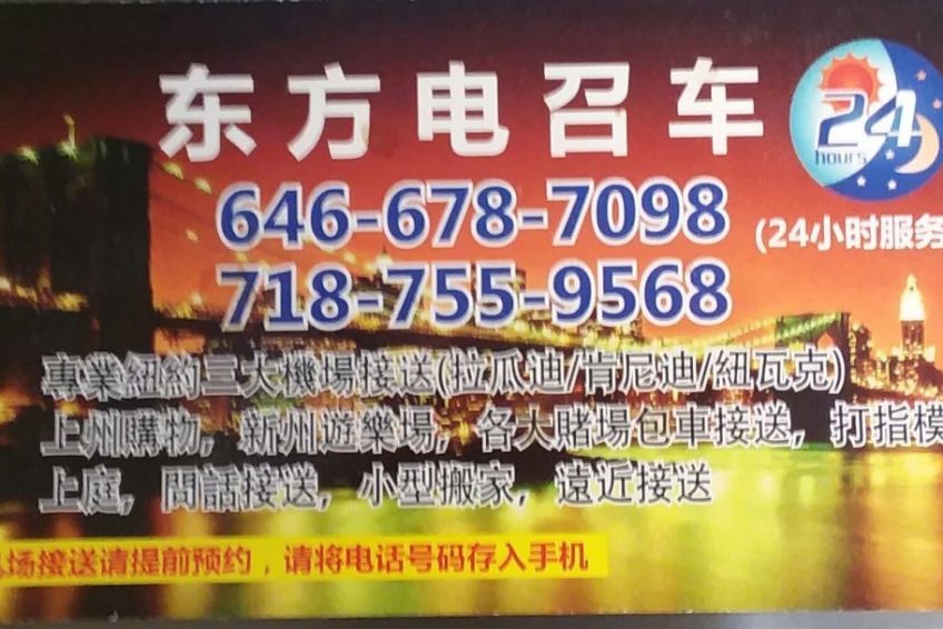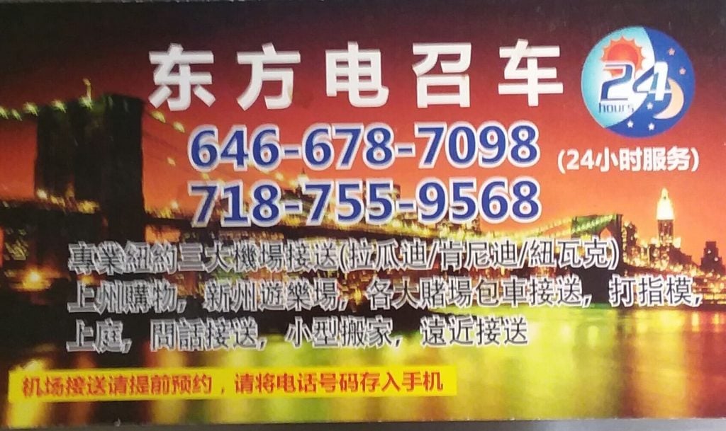 是纽约华人最大的叫车包车服务公司。提供纽约机场接送,出行打车,商务旅游包车,纽约地接,美东包车旅游,纽约奥特莱斯购物包车,纽约一日游包车等出租车接送服务。服务范围包括纽约,长岛,新泽西,康州,费城,波士顿等美东地区主要城市。车型齐全,价格实惠是纽约华人电召车的首选。