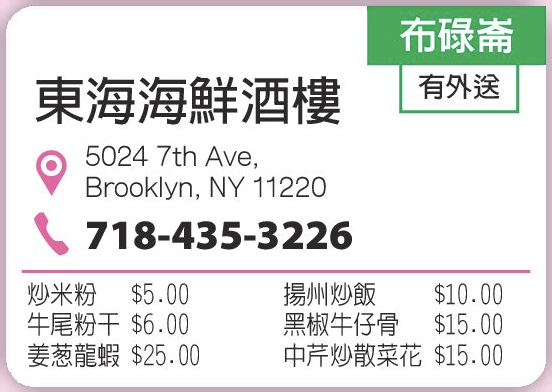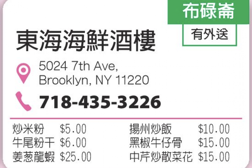 位于布鲁伦七大道的东海酒家,乃福州地道的海鲜酒家,提供各色海鲜以不同的方面生吃、蒸煮以及各式福州小炒、时令蔬菜、甜品等。
