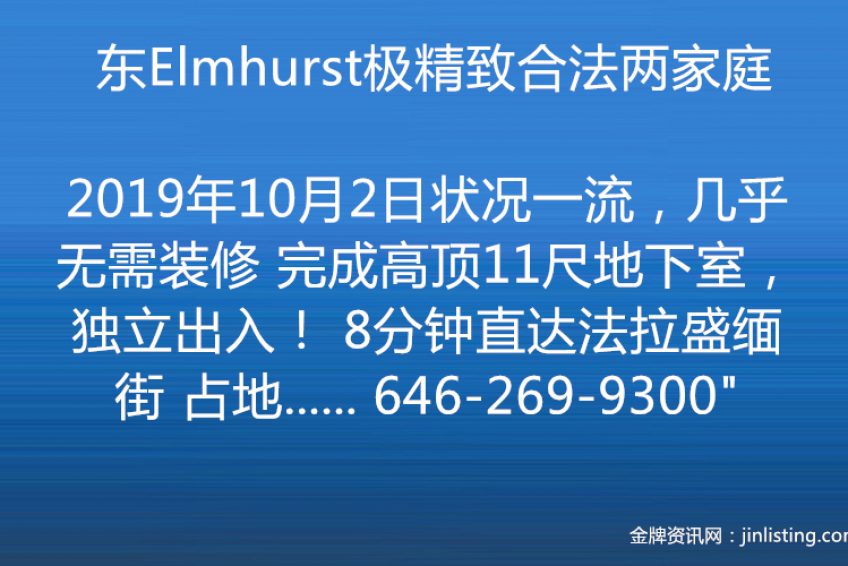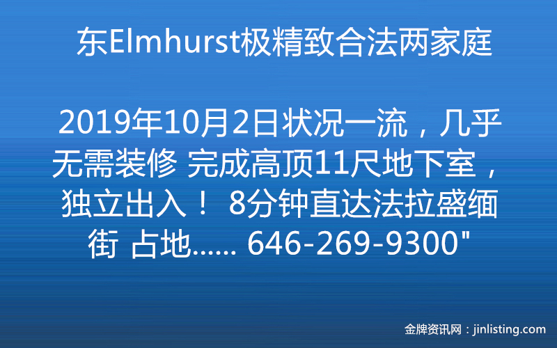 “东Elmhurst极精致合法两家庭 状况一流,几乎无需装修 完成高顶11尺地下室,独立出入! 8分钟直达法拉盛缅街 占地40×100 一楼面积23×53 二楼面积23×45 地税$6300 售价$128万8 预约看房请联系 646-269-9300”