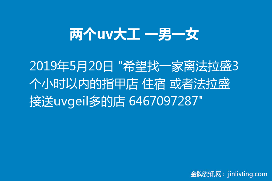 两个uv大工 一男一女 “希望找一家离法拉盛3个小时以内的指甲店 住宿 或者法拉盛接送uvgeil多的店 6467097287”
