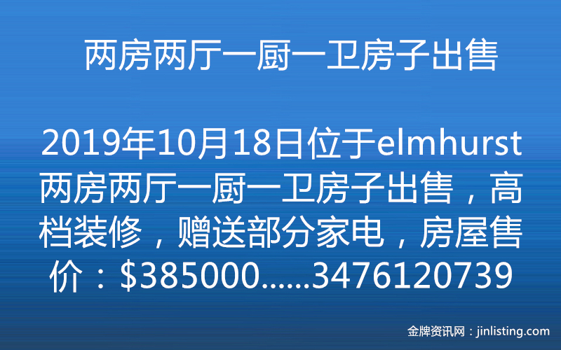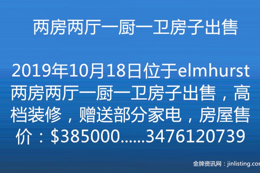位于elmhurst 两房两厅一厨一卫房子出售,高档装修,赠送部分家电,房屋售价:$385000,管理费$935.07,除电全包,有意者请联系:3476120739
