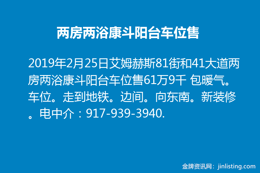 艾姆赫斯81街和41大道两房两浴康斗阳台车位售61万9千 包暖气。车位。走到地铁。边间。向东南。新装修。电中介:917-939-3940.