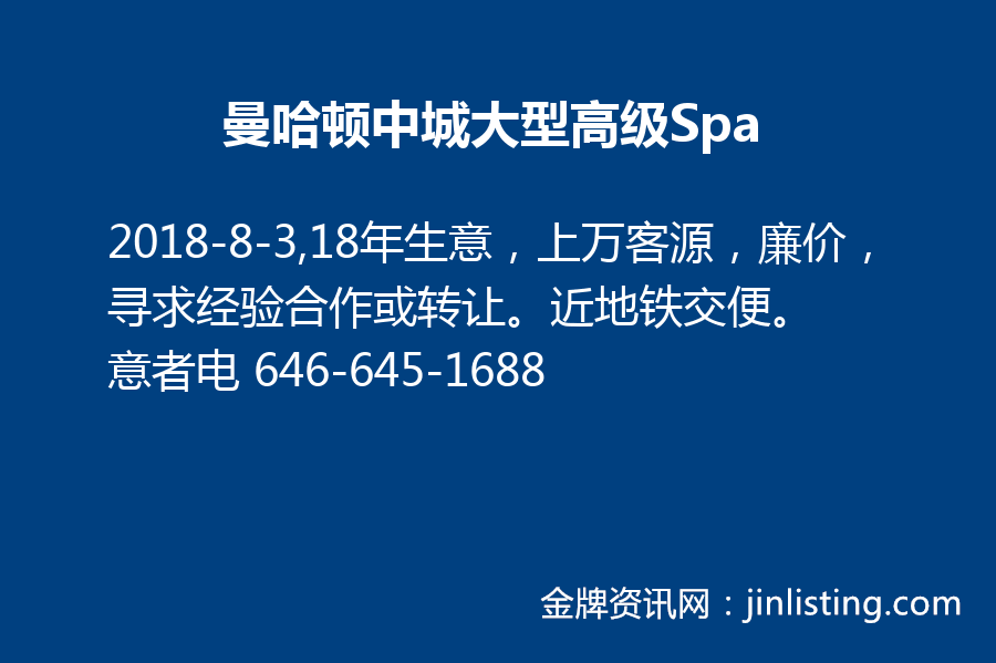 曼哈顿中城大型高级Spa,18年生意,上万客源,廉价,寻求经验合作或转让。