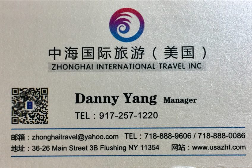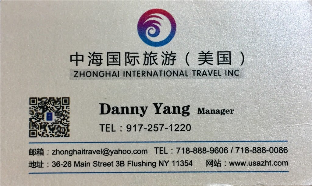 ZHONGHAI INTERNATIONAL TRAVEL INC 中海国际旅游(美国) Danny Yang Manager TEL : 917-257-1220 邮箱 : zhonghaitravel@yahoo.com 电话TEL : 718-888-9606 / 718-888-0086 地址: 36-26 Main Street 3B Flushing NY 11354 网址: www.usazht.com