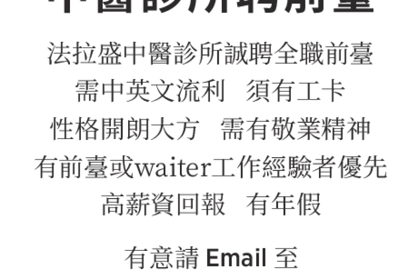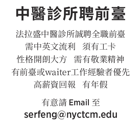 法拉盛中医诊所,诚聘全职前台。需中英文流利,有年假。