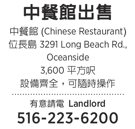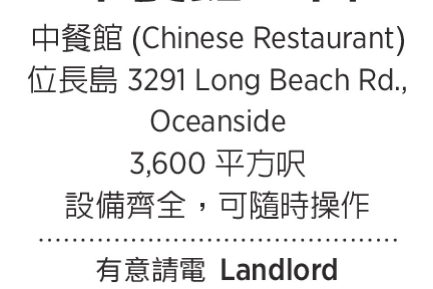 一家中餐館(Chinese Restaurant),位於長島 3291 Long Beach Rd., Oceanside,3,600平方英呎, 設備齊全,可隨時操作,有意者,