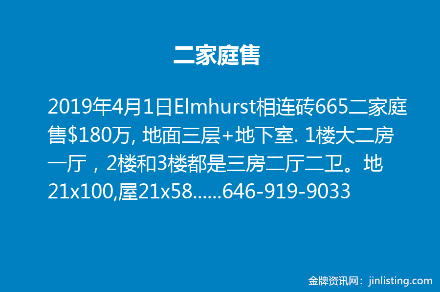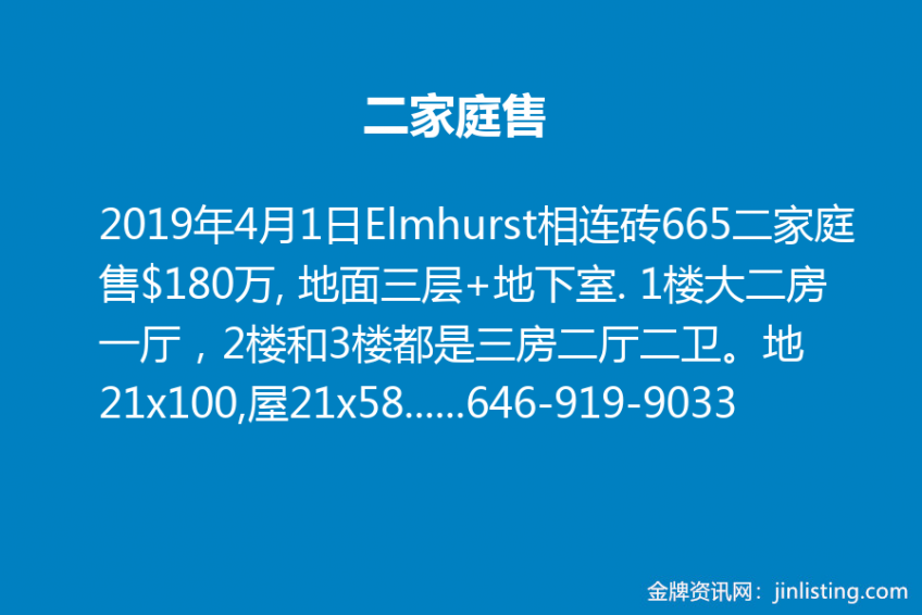 Elmhurst相连砖665二家庭售$180万, 地面三层+地下室. 1楼大二房一厅,2楼和3楼都是三房二厅二卫。地21×100,屋21×58.每层1218尺。地税$1万/年。整栋收租$9000/月。有车库车位。近金麟超市,Elmhurst 图书馆,7分钟走到Grand Ave R,M 地铁。投资自住首选!call Cindy Chen:646-919-9033
