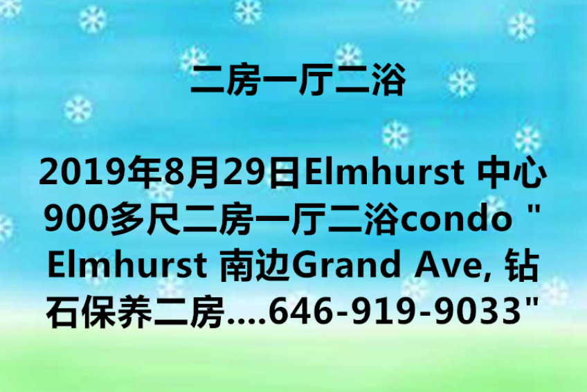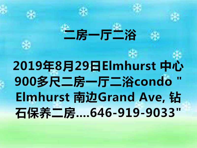 Elmhurst 中心900多尺二房一厅二浴condo “Elmhurst 南边Grand Ave, 钻石保养二房二浴900尺电梯Condo 加阳台售$65万7。容易改三卧还有客厅!室内洗衣机,烘干机。地稅$74/月,减税到2031年。 管理费$296/月。几分钟Grand Ave R, M地铁. 1分钟Q58, Q59公车。有去唐人街华人小巴。走路到皇后购物中心。周边餐馆超巿林立。9 分小学, 中学PS 102. call Cindy Chen 646-919-9033”