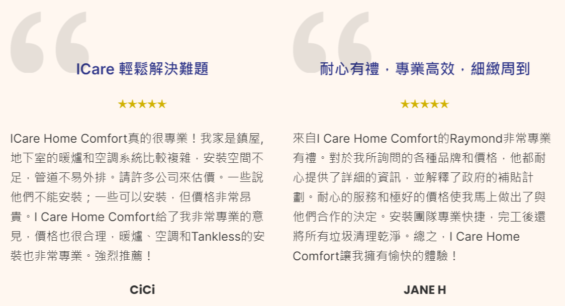 1,Google 5星客服好評,Homestars 9. 9評分。诊断过48,600幢房子,服务过42,600个家庭,安装过超过23,800 (2000 X 12) 台冷暖设备。