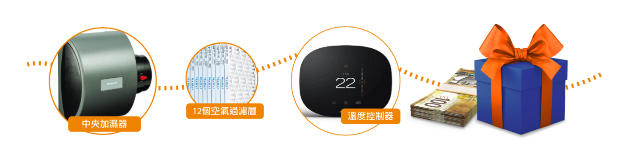 独家赠送礼品套装:中央加湿器、温控器、空气过滤网